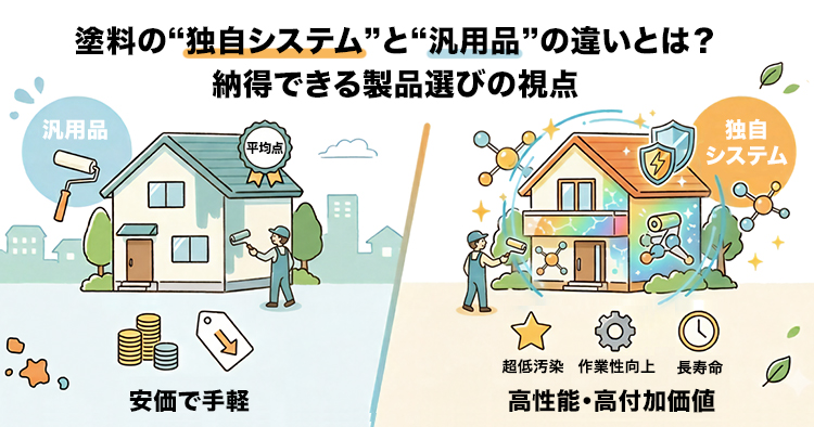 外壁塗装のカタログを開くと、必ずと言っていいほど「独自システム」や「オンリーワンの技術」という言葉が並びます。一方で、業界内で長く使われている「汎用品」と呼ばれる定番塗料も根強い人気があります。