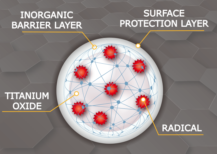 - It protects surface layer of titanium oxide, which is generation source of radicals, and suppresses the generation of radicals.