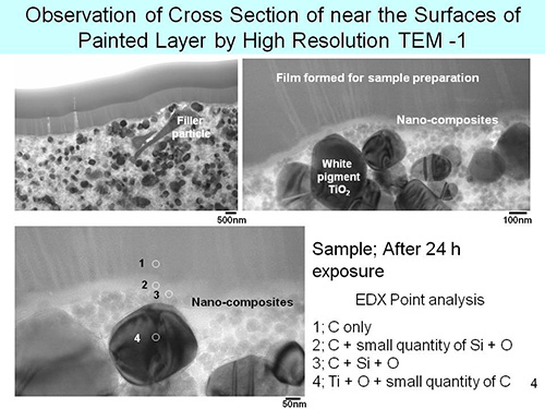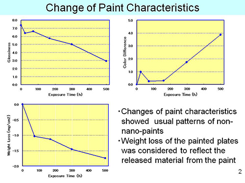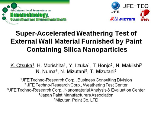 発表では、人体に有害なナノマテリアルの放散量が基準値の9万分の1と非常に少ないことと、経年による塗膜厚の減少がフッ素樹脂塗料なみに少ないため、安全で耐候性に優れると考えられ、ナノテクノロジーを用いた効果があると報告されました。